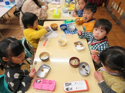 お昼になり、出来上がったばかりのおもちを皆で食べると、「美味しいね」「おかわりしたい」と、ニコニコで食事をしていた子どもたち。